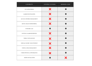 Central Station: Simply escalates triggered alarms via call trees without oversight of video, access control, or other systems, which can often lead to false dispatches and associated penalties.