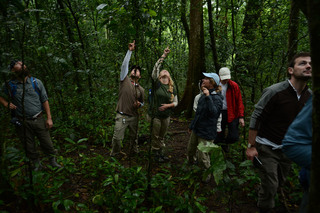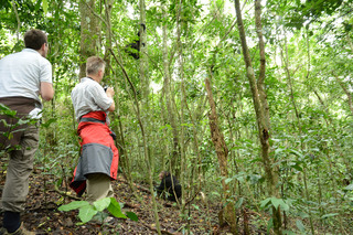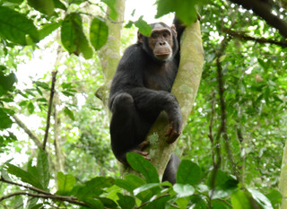 This went on for some time before we started to hike through the underbrush in the muddy and hilly terrain. While hiking we could hear the chimps calling loudly to each other high up in the trees. Evidently, once they were done eating, they would come down, run across the ground and run back up. At one point, two females came down within 10 meters of us, screaming at each other and seemingly beating each other, before one ran back up. A few minutes later another chimp camp down, ran straight at me, and swerved at the last minute having come within a few inches of me. It then ran right through Ed, Joseph and Andre. Seeing its huge arms and muscular body as it approached was frightening! Ed, Joseph and Andre had a good laugh at the expression on my face as I turned away from the chimp.