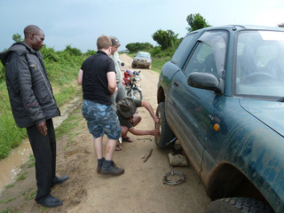 Ten minutes later, their hearts are still racing when they recount their story to Shad and George who are also on the same game track. Shad and George drive off to find other elephants at a safe distance as well as some hippos in the river. While stopped, Tim and Vivian did not notice that one of their tires was slowly going flat, probably due to the frantic dash down the very rough roads. Tim is not too pleased about having to get out of the car. He does not even know about the black mambas. Luckily, George and Eric are a ways away, but close enough to see Tim wave them down. The perfect guys to flag down as Eric and George have experience changing the tire on the Rav4s.