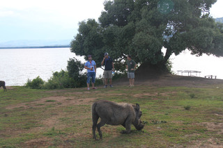 Our destination is a campsite along Lake Mburo in a national park. Little does everyone know that once they pass the gates, they will encounter large numbers of zebra. The long road is instantly forgotten. Even more fun is the fact our campsite is home to five or six warthogs. We have to set up our tents amidst grazing and snorting warthogs, as well as the now familiar sound of snorting hippos in the lake.