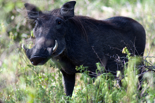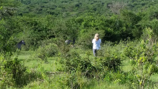 Within minutes, I am surprised at the teamwork between James and Terry, two very different personalities, and how pleasant it is to be with them on our “treasure” hunt. They are having fun, but are serious about their strategy to find and photograph the various signs in the park as well as wildlife. In order not to get too lost on the different tracks, they actually employ a compass. This is turning into great fun. And lo and behold, 15 minutes into our trek, a hippo dashes across the road in front of us in broad daylight. It must have gotten caught out when the sun rose and took refuge in a mud hole. We must have startled it and it made a run for it right in front of us. We follow it for a bit just as surprised as the hippo must have been. He does quickly stop and give us the eye to let us know to stop following him. We oblige.